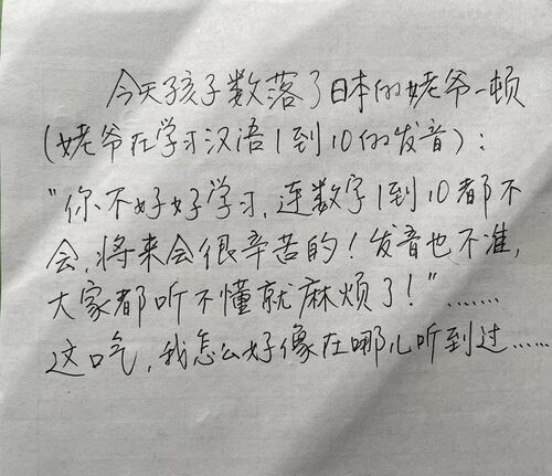 今日子供が日本のじいじに、「(1から10の中国語発音を学習中のじいじに)一生懸命勉強せず、1から10までも言えないなんて、将来きっと苦労するよ!発音も間違っているし、聞き取ってもらえなかったら面倒だよ!」と、あれこれ言っていた。 あれ?この口調、…
